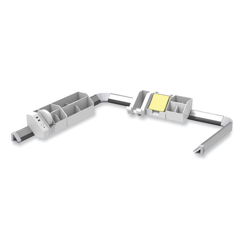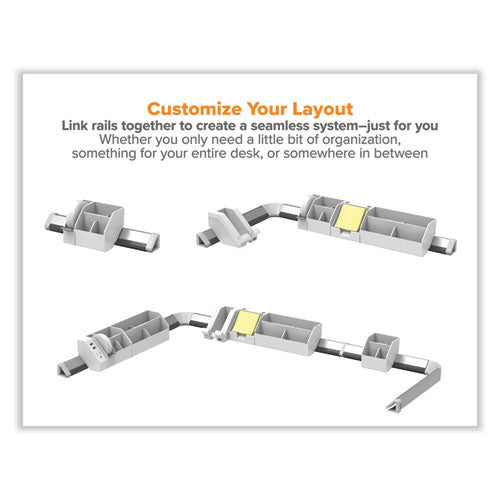 Jam-packed with all office organization essentials, this 14-piece Konnect™ Desk Organizer set transforms your office from no thanks to yes please! Dock any connected accessories to the three cord management rails, along with hiding pesky wires that no one wants to look at. The note/business card holder displays sticky notes for unique organization and comes with a yellow pad of sticky notes. The tape dispenser is an office must. It comes with a single roll of tape so you're off to a steady start. Have a lot of knick-knacks that need to be tucked away somewhere? The one long and two short storage bins do just that. They hold anything from highlighters to extra staples. They even come with modular dividers and removable lids! The power hub allows for easy charging of any device as it includes a power outlet and two USB charging ports. The phone dock safely houses your phone and also features a USB port.Package Includes: (1) 12" Cord Management Rail; (2) 21.5" Cord Management Rails; (2) Short Storage Bins; (1) Wide Storage Bin; (1) Tape Dispenser; (1) Sticky Note Holder; (1) USB Phone Dock; (1) Power Hub; Mounting HardwareNote: This is a non-returnable item.