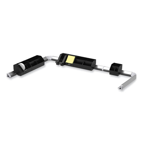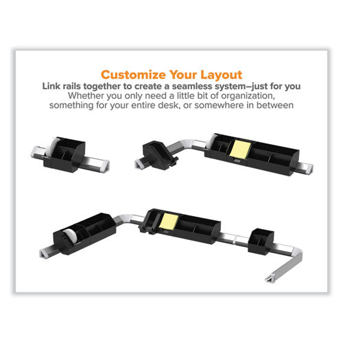 Use this 17-piece Konnect™ office organizer kit to give your office a makeover and do away with all that distracting clutter. It all starts with the cord management rails. This kit comes with two long and short rails that you can connect together using the corner connectors and extenders. Dock all your Konnect™ products to the rail also for zero movement. Tuck messy wires into the rail to automatically clear your desktop of excess. You also get two wide and short storage bins that hold all sorts of items. Have loose pencils lying around everything? Place them into one of the storage and pencil holders so they're safely concealed in a single location. Each bin comes with modular dividers and removable lids for further organization. Everyone needs tape at their desk. The tape dispenser is super compact and has an easy-cutting blade. Plus, it includes a single roll of office tape. The card holder is unique as it holds business cards and sticky notes, and comes with a yellow sticky note pad to start you off. Time to charge up! The phone dock provides a resting spot for your phone while charging it with the USB port.Package Includes: (2) 12" Cord Management Rails; (2) 21.5" Cord Management Rails; (2) Short Storage Bins; (2) Wide Storage Bins; (1) Tape Dispenser; (1) Sticky Note Holder; (1) USB Phone Dock; (1) Power HubNote: This is a non-returnable item.