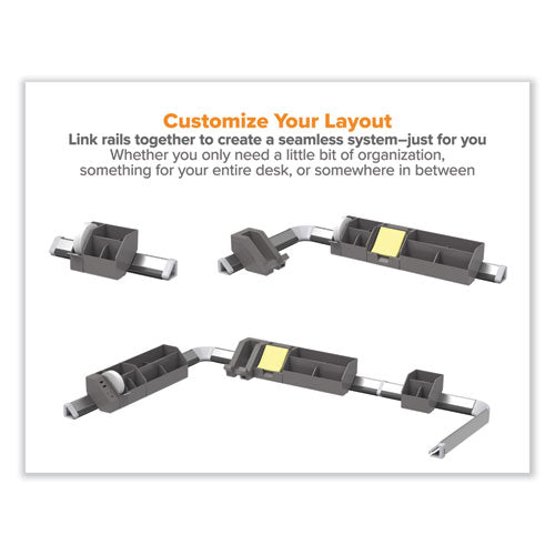 Use this 17-piece Konnect™ office organizer kit to give your office a makeover and do away with all that distracting clutter. It all starts with the cord management rails. This kit comes with two long and short rails that you can connect together using the corner connectors and extenders. Dock all your Konnect™ products to the rail also for zero movement. Tuck messy wires into the rail to automatically clear your desktop of excess. You also get two wide and short storage bins that hold all sorts of items. Have loose pencils lying around everything? Place them into one of the storage and pencil holders so they're safely concealed in a single location. Each bin comes with modular dividers and removable lids for further organization. Everyone needs tape at their desk. The tape dispenser is super compact and has an easy-cutting blade. Plus, it includes a single roll of office tape. The card holder is unique as it holds business cards and sticky notes, and comes with a yellow sticky note pad to start you off. Time to charge up! The phone dock provides a resting spot for your phone while charging it with the USB port.Package Includes: (2) 12" Cord Management Rails; (2) 21.5" Cord Management Rails; (2) Short Storage Bins; (2) Wide Storage Bins; (1) Tape Dispenser; (1) Sticky Note Holder; (1) USB Phone Dock; (1) Power HubNote: This is a non-returnable item.