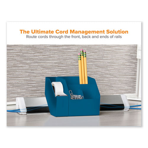 Some say that organization is the key to success, and they're right! This five-piece Konnect™ workspace and cord management kit provides a fully functional desktop from corner to corner. Keep unsightly cords and tangled wires out of view with the 21.5" cord management rail, which also lets you dock any of the Konnect™ accessories directly on your desktop. This office supply organizer kit includes four unique docking units. The tape dispenser is slim and compact, making it easy to use with its extended blade. It also consists of a roll of office tape to prepare you for any task. The sticky note holder neatly stores business cards and Post-it notes, ensuring important memos stay organized and visible. Plus, it comes with a 3" x 3" yellow sticky note pad! The short storage bin is ideal for holding tacks, pens and other small office essentials. Lastly, the USB phone dock provides a secure spot for your phone, featuring a USB port for convenient charging and easy viewing.Package Includes: (1) 21.5" Cord Management Rail; (1) Short Storage Bin; (1) Sticky Note Holder; (1) Tape Dispenser; (1) 0.75" Office Tape Roll; (1) USB Phone DockNote: This is a non-returnable item.