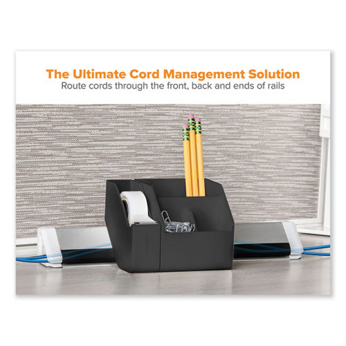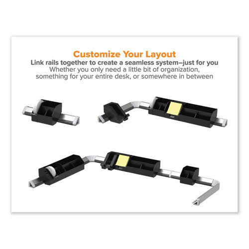De-clutter your desk in a flash with this Nine-Piece Konnect™ Desk Organizer set. This kit is loaded with everything you'll need for a clean and stunning desk. The short and long cord management rails not only hide unpleasing wires that normally rest under your feet, but also dock all the accessories to one stable spot. Keep the essentials nearby. The short and wide storage bins hold everything from pens and paper clips to your favorite chapstick. The tape dispenser is slim and provides easy cutting. The sticky note holder safely displays important sticky notes and business cards. It even has two integrated holders for pens and pencils! Get a single roll of office tape and a yellow sticky note pad with these items. The USB phone dock allows for easy use and viewing of your phone while charging it with the USB port.Package Includes: (1) 12" Cord Management Rail; (1) 21.5" Cord Management Rail; (1) Corner Connector; (1) Short Storage Bin; (1) Wide Storage Bin; (1) Tape Dispenser; (1) 0.75" Office Tape Roll; (1) Sticky Note Holder; (1) USB Phone DockNote: This is a non-returnable item.