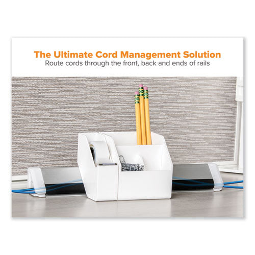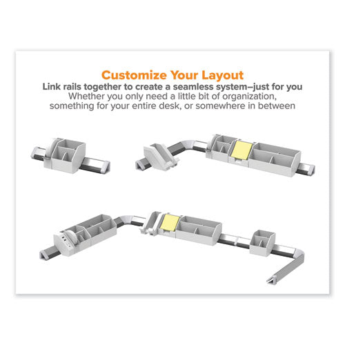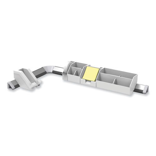 De-clutter your desk in a flash with this Nine-Piece Konnect™ Desk Organizer set. This kit is loaded with everything you'll need for a clean and stunning desk. The short and long cord management rails not only hide unpleasing wires that normally rest under your feet, but also dock all the accessories to one stable spot. Keep the essentials nearby. The short and wide storage bins hold everything from pens and paper clips to your favorite chapstick. The tape dispenser is slim and provides easy cutting. The sticky note holder safely displays important sticky notes and business cards. It even has two integrated holders for pens and pencils! Get a single roll of office tape and a yellow sticky note pad with these items. The USB phone dock allows for easy use and viewing of your phone while charging it with the USB port.Package Includes: (1) 12" Cord Management Rail; (1) 21.5" Cord Management Rail; (1) Corner Connector; (1) Short Storage Bin; (1) Wide Storage Bin; (1) Tape Dispenser; (1) 0.75" Office Tape Roll; (1) Sticky Note Holder; (1) USB Phone Dock; Mounting HardwareNote: This is a non-returnable item.