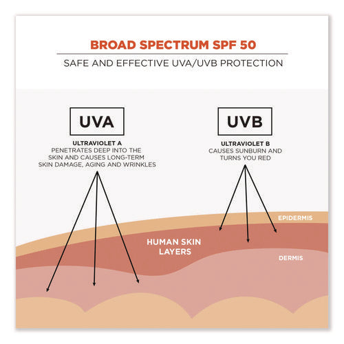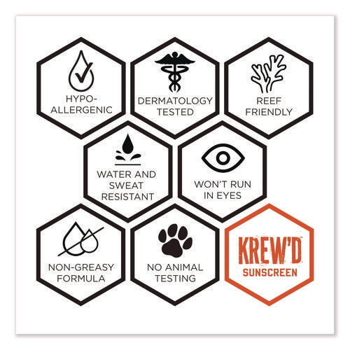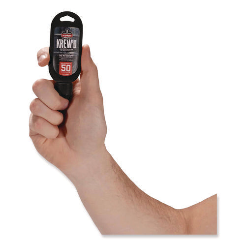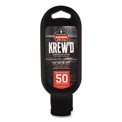 The Krewd 6352 SPF 50 Sunscreen Lotion provides safe and effective broad-spectrum UVA/UVB protection against sunburn. It's a water-resistant and sweat-resistant sunscreen that lasts for 80 minutes. This FDA-approved sunscreen comes in a 1.5 oz squeeze bottle with a connection point for an optional hang cord or carabiner to attach to belt loops, backpacks, keys, and more. The 50 SPF offers protection against both UVA and UVB rays, which can cause skin cancer. Sport formula provides even coverage for better protection. It's lightweight, non-greasy, absorbs quickly and is free of paraben/phthalates and octinoxate/oxybenzone. Slather. Work. Repeat. Skin damage can occur all year round from sun exposure. Sunblock should be applied evenly and thoroughly on exposed skin. We recommend applying liberally 15 minutes before you go into the sun to allow the sunscreen to fully bind to the skin. Reapply every two hours, or as needed.Note: This is a non-returnable item.