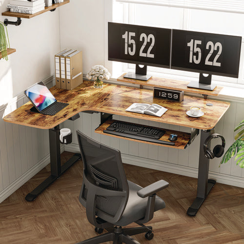 This L-shaped standing desk allows you to make the most of your corner space. Wood finish is perfect for any home office computer setup. Includes cup holder, headphone hook, cable management tray, and cloth mouse pad.Note: This is a non-returnable item.