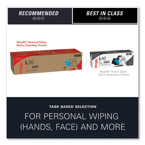 Regardless of your task, industry or budget, our WypAll® wipes, towels and cloths are designed to give you the durability, absorbency and versatility of a laundered cloth with the cost efficiency and hygiene of a disposable. When you're looking for a lighter-weight towel at an everyday great price, you can trust WypAll* L30 Towels. They are designed with the DRC (double re-creping) process, which gives you high surface softness (a cloth-like feel) with a reinforced grid that's strong for wet surface wiping and cleaning. These WypAll* L30 Towels are a great choice to replace air laid towels. They're soft enough to use on skin, so they're popular for use in healthcare and patient care. They're also tough enough for light-duty processing, janitorial tasks and maintenance (as an alternative to cloth rags). These towels are a trusted tool to help you get the job done right. As we look towards the future, Kimberly-Clark Professional is committed to providing a wide collection of essential products and services that help make your workplace exceptional. Our dedication to innovation has helped businesses confidently navigate change and empowered people at work for nearly 150 years and we are committed to do so for years to come.