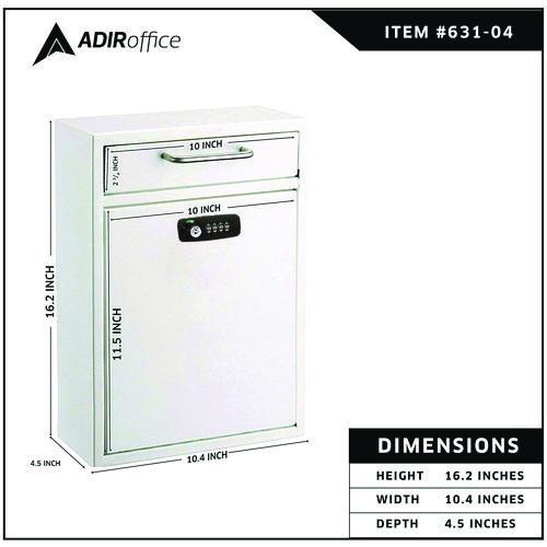 The AdirOffice Locking Drop Box Wall Mounted Mailbox is designed to hold keys, cash, envelopes or other important materials that need to be dropped off after hours. Constructed of durable, heavy duty 16-gauge galvanized steel to provide long-lasting strength and furnished using a powder-coated, scratch-resistant finish, this mailbox is made to meet your needs year after year. Ideal for retail stores, military bases, rental facilities, customer service counters, manufacturing plants, auto dealers and other facilities, this secure drop box features an anti-fishing bin door that accepts letters, checks, keys and other small bundles. To prevent theft, an anti-pry latch locking mechanism is used. The locking access door features a commercial grade 12-disc wafer lock and includes three laser cut keys to ensure the items inside are safe and secure. To finish it off, this mailbox includes four mounting screws, four stainless steel washers, a driver bit and a drill bit for quick and easy installation of the box wherever you'd like to mount it.Package Includes: Drill Bit; Driver Bit; (4) Mounting Screws; (4) Stainless Steel WashersNote: This is a non-returnable item.