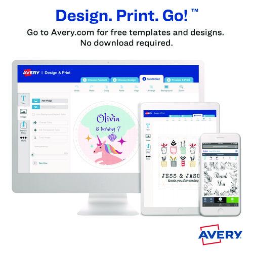 Make sure your handmade gifts and products stand out with Avery labels that offers the professional finishing touch you need. The print-to-the-edge capability allows you to create bright, eye-catching full-bleed labels with sharp text and crisp images printed right to the edge of the stickers with no border or margin. Sure Feed technology helps deliver a more reliable feed through your printer to prevent print misalignments and paper jams. These printable stickers are quick and easy to apply with the patented Easy Peel label sheets with Pop-up Edge. Simply fold the sheet back to display the label edges for convenient and fast peeling that saves time and avoids label waste. Compatible with both laser and inkjet printers to provide crisp and vivid prints. Avery Design & Print makes it easy to create customized labels from your own home or business. The free browser-based software has everything you need to design gift labels, soap labels, thank you stickers, round stickers for kids, party favor labels, and more. Try it out today.