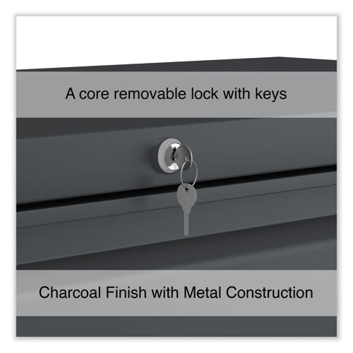 Drawers with side-to-side hang rails to accommodate letter/legal hanging files. Full drawer extension on steel ball bearing telescoping slide suspension helps drawers glide with ease. Stylish, full-width radius edge recessed pulls help to quickly open and close drawers. Anti-tipping interlock system allows only one drawer to open at a time. Single key core removable lock with two keys. Four adjustable leveling glides. Durable powder coated finish helps prevent scratches.