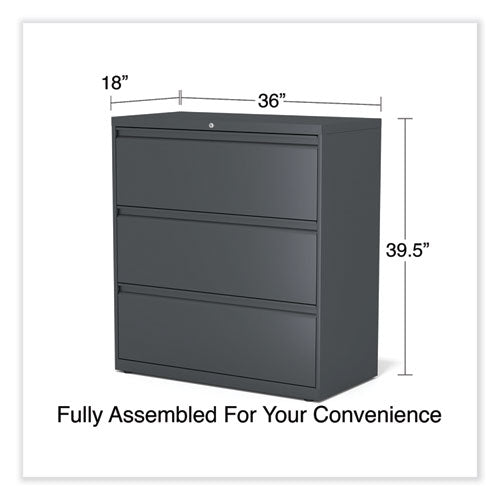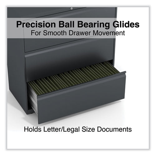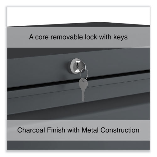 Drawers with side-to-side hang rails to accommodate letter/legal hanging files. Full drawer extension on steel ball bearing telescoping slide suspension helps drawers glide with ease. Stylish, full-width radius edge recessed pulls help to quickly open and close drawers. Anti-tipping interlock system allows only one drawer to open at a time. Single key core removable lock with two keys. Four adjustable leveling glides. Durable powder coated finish helps prevent scratches.