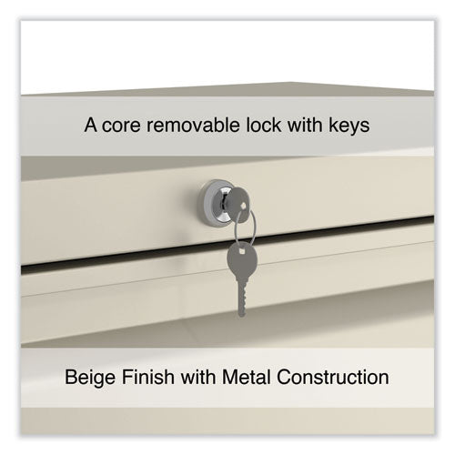 Drawers with side-to-side hang rails to accommodate letter/legal hanging files. Full drawer extension on steel ball bearing telescoping slide suspension helps drawers glide with ease. Stylish, full-width radius edge recessed pulls help to quickly open and close drawers. Anti-tipping interlock system allows only one drawer to open at a time. Single key core removable lock with two keys. Four adjustable leveling glides. Durable powder coated finish helps prevent scratches.