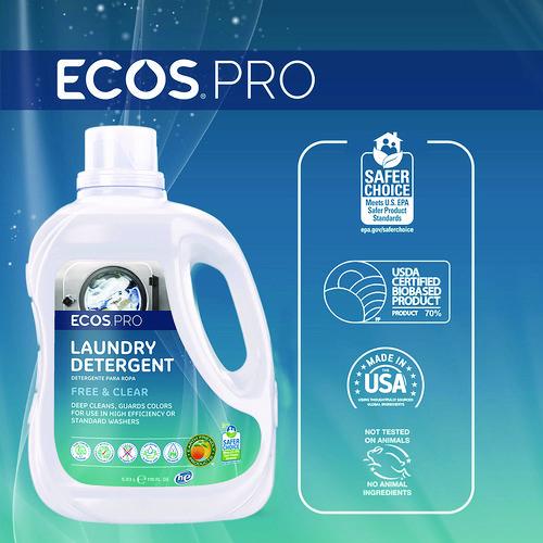 Hypoallergenic ECOS PRO laundry detergent deep cleans, guards colors and can be used in high-efficiency machines or standard machines in hot, warm or cold water. Launder clothes, sheets, towels and linens without disintegrating fabric fibers or fading colors; leaves laundry soft and comfortable. The pH balanced formula is made using sustainable, plant-powered surfactants. Made without dyes; gray water and septic safe. Recognized by the US EPA's Safer Choice and USDA's BioPreferred program. Not tested on animals. Manufactured in a facility that is LEED Zero Carbon, LEED Zero Waste, and LEED Zero Energy Certified.Note: This is a non-returnable item.