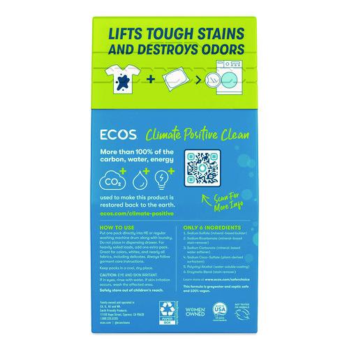 Redefining convenience, these sustainable, all-in-one laundry packs make washing a breeze. Our advanced, plant-powered formula harnesses the natural cleaning power of enzymes, which penetrate deep into fabric fibers to break down and eliminate stubborn stains, ensuring a thorough and effective clean with every wash. Say goodbye to sticky spills and hoisting heavy jugs, and elevate your laundry experience with ECOS the sustainable, convenient, and highly effective solution you've been searching for! Works well with all washing machines, temperatures, and cycles. 100% plastic free packaging reduces plastic waste, contributing to a sustainable future. Not tested on animals. Manufactured in a facility that is LEED Zero Carbon, LEED Zero Waste, and LEED Zero Energy Certified.Note: This is a non-returnable item.