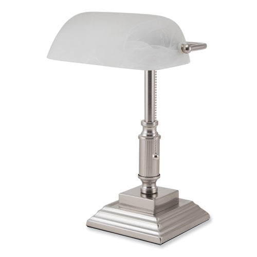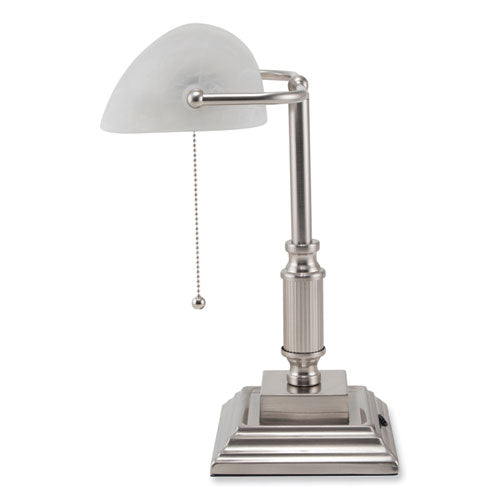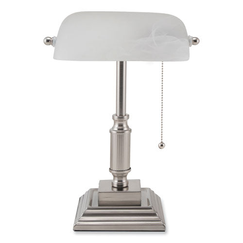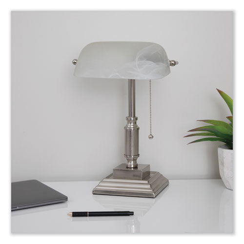This distinguished banker's style lamp will be a welcome addition to any home office or executive suite. Featuring all metal construction and a rich brushed nickel finish, the lamp is beautifully highlighted by the marble frosted white glass shade. The traditional styling includes an old-fashioned pull chain and a multi-step pedestal base. The lamp is 14.75 inches tall and is ETL listed for use with a 10W LED bulb, which is included.Package Includes: (1) 10 W LED BulbNote: This is a non-returnable item.