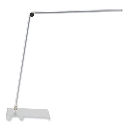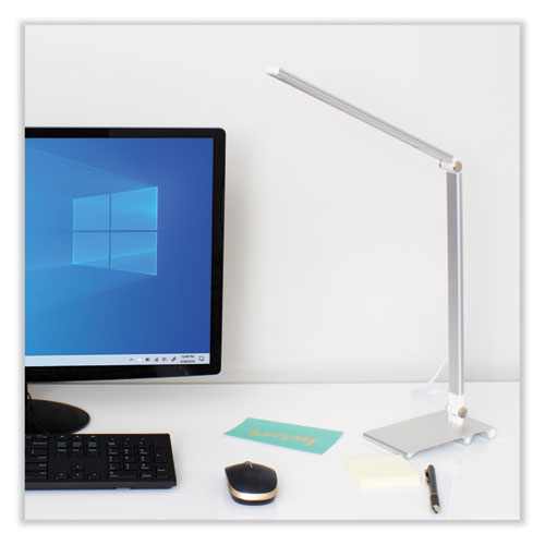 This energy-efficient 5W LED desk lamp is perfect for any home or office, with a contemporary design that will complement any decor. The bright 5W non-replaceable LEDs have an average rated life of 20,000 hours for long-lasting performance. Includes a built-in diffusor to evenly distribute light and help to eliminate glare. Features a 3-level dimming touch switch to easily adjust light brightness. The 2-point adjustable arm helps direct the light where needed. Constructed of long-lasting aluminum with a metallic silver finish, the lamp stands about 15 inches tall in the usual user position. Its' compact footprint measures 6 x 3.5 inches, making this an ideal lamp for small spaces.Package Includes: 5 W LED Bulbs; Lithium BatteryNote: This is a non-returnable item.