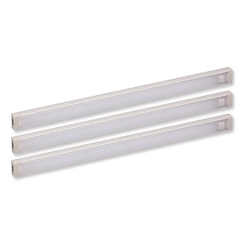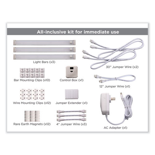 Fully-equipped and ready for a quick, tool-free installation, this magnetic under cabinet task light kit with a built-in motion sensor is an essential addition to any workspace. Self-adhesive mounts allow for easy application practically anywhere, while optional magnets are ideal for metal surfaces like office and cubicle shelving. Easily adjust the intensity of illumination as these three ultra-thin 12" light bars include 10 brightness levels. For further convenience, they also feature an optional automatic shutoff after three hours. Powerful LEDs simulate natural daylight, while providing high-contrast task lighting that reduces eyestrain and increases productivity. Say goodbye to harsh fluorescent office task lights and hello to high quality, natural daylight with PureOptics LED magnetic under cabinet lights!Package Includes: (3) 12" Light Bars; (12) Wire Mounting Clips; (12) Rare Earth Magnet Mounting Clips; (10) Light Bar Mounting Clips; (2) 30" Jumper Wires; (1) 12" Jumper Extender; (3) 4" Jumper Wires; (10) Jumper Extenders; (1) Control Box; (1) AC AdapterNote: This is a non-returnable item.