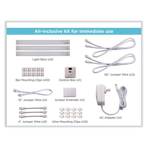 Each system arrives at your door with three 9" light bars, connecting wires and clips, a motion sensor for power control, and an AC adapter. With a clean and crisp color temperature, 10 brightness settings and an optional 3-hour automatic shutoff, this cabinet lighting kit has the power to transform any room in your home.Package Includes: (3) 9" Light Bars; Connecting Wires and Clips; Motion Sensor; AC AdapterNote: This is a non-returnable item.