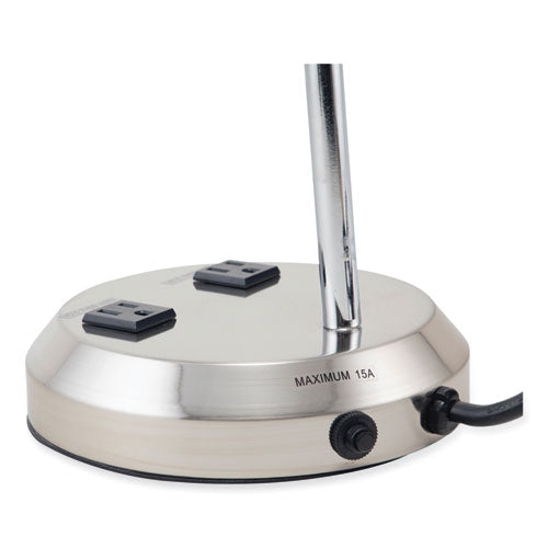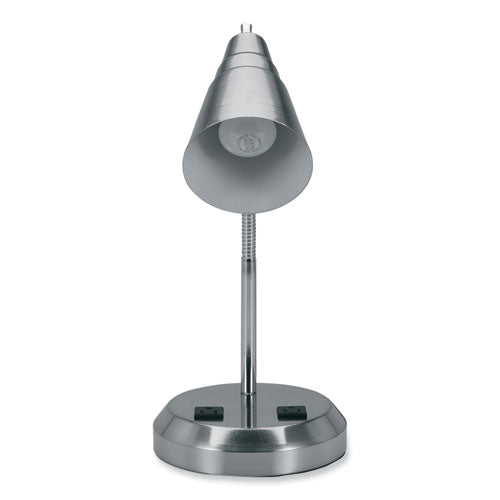 This attractive all-metal task lamp includes the convenience of two base-mounted grounded 2.5 A power outlets for powering and charging of small personal devices. The power outlets include a surge protector for added safety. A metal gooseneck arm provides added flexibility and the on/off switch is located directly on the shade for user convenience. This lamp is ETL listed for use with a 10W LED bulb, which is included.Package Includes: (1) 10 W LED BulbNote: This is a non-returnable item.