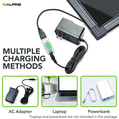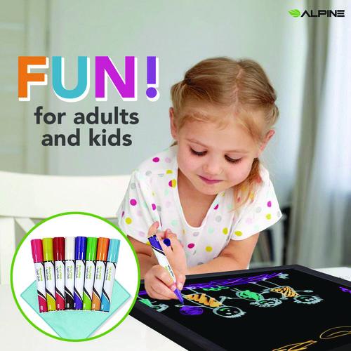 The Alpine Industries LED Illuminated Hanging Message Writing Board features a glowing neon notice sign with 48 different flashing display styles. With a main panel made of high-quality tempered glass fitted in a durable aluminum frame, this LED writing board meant for outdoor restaurant or venue advertising. Just attach to chain, hang on your wall, plug in, and use the adaptor remote button to maneuver between flashing functions. Guide customers towards your promotional pricing or upcoming events using eight colored marker pens. Prior to use, please shake markers while capped to keep from damaging clothing. Keep capped until ready for use. Also includes hanging chain, power adapter, remote control, erasing towel and User Manual.Package Includes: (1) Power Adapter; (8) Colored Marker Pens; (1) Remote Control; (1) Erasing Towel; (1) Hanging Chain; Clear User's ManualNote: This is a non-returnable item.