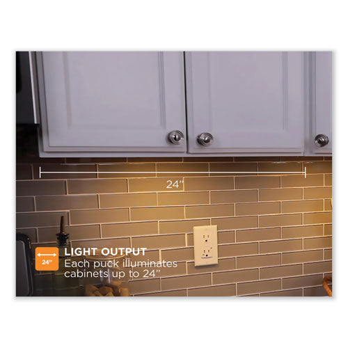 Radiate warmth throughout your kitchen with the BLACK+DECKER LED Under Cabinet Puck Light Kit in warm white. The easiest under cabinet lighting to install for any homeowner, this kit requires no tools, no pros and only five minutes of your time! Linkable up to seven lights (included), these puck lights shine bright at 910 lm and 10.5 W. Dim and brighten as you see fit for any task with the hands-free motion sensor and 10 brightness levels.Package Includes: (7) Puck Lights; (7) Screws; 12 W Adapter; 32" Tape StripNote: This is a non-returnable item.