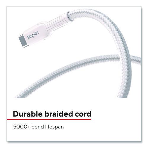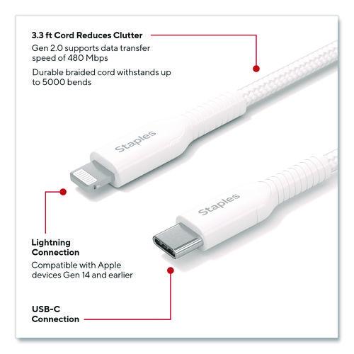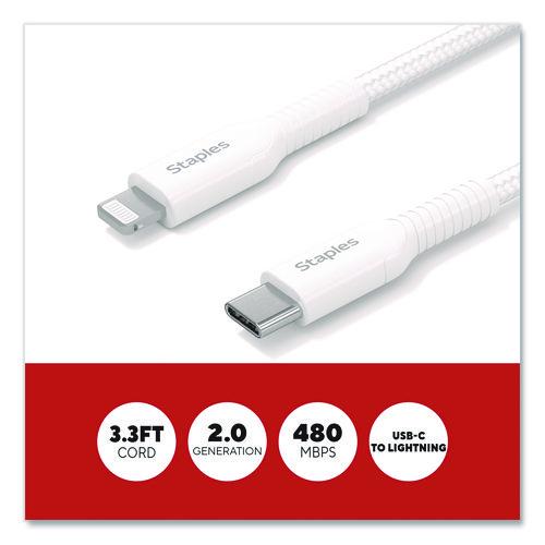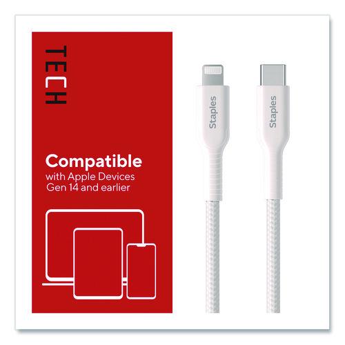 Power your Apple devices (Generation 14 and earlier) with this lasting Staples® USB-C to Lightning braided cable. The unique braided design provides extra durability, prevents tangles and has been tested to withstand up to 5,000 bends. The cable length gives extra reach when needed and is perfect for comfortably using devices while they charge.