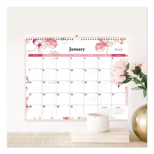 This refreshing floral wall calendar is a great way to keep track of your schedule. The pages cycle through several color themes to keep things fresh. Use it for appointments, birthdays, events, ideas and more! The one-month-per-page format helps you see your schedule at a glance and includes Sunday through Saturday scheduling. Generously sized daily blocks allow for multiple entries per day and feature a count of days past and remaining. Major holidays are listed, and reference calendars on each page (past and upcoming month) help you plan for the future. The paper is premium-quality and acid-free, minimizing potential ink bleed-through. Mount your calendar securely with a twin-wire binding and sturdy wall-mount hook.Note: This is a non-returnable item.