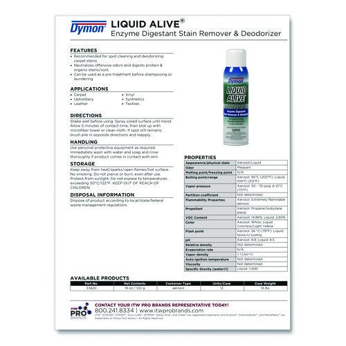 Enzyme digestant/deodorizer is recommended for spot cleaning carpets, upholstery, textiles, vinyl, leather and synthetics. Active cultures fully digest protein- and organic-based soils, fully eliminating stains and attendant odors. Solution works as an excellent pre-spot treatment before shampooing or laundering.Package Includes: Includes 12 cans.