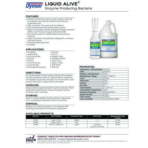 Enzyme producing bacteria digests and liquefies organic waste, grease and food by-products, helping to eliminate malodors and reduce suspended soils--while leaving a pleasant fragrance. Solution is highly resistant to disinfectants, detergents, sanitizers and free chlorine. Safe, non-toxic, non-acid and non-alkaline.Package Includes: Includes four bottles.