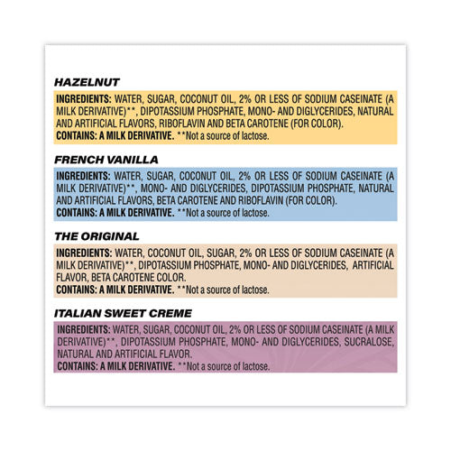 Stir up the perfect cup with Coffee mate, America's #1 creamer brand. It is shelf stable with no refrigeration needed. Coffee mate liquid creamer singles retain their delicious flavor at room temperature for up to nine months unopened. Find your perfect match with NESCAFE Coffee and Coffee mate liquid creamer singles. All Coffee mate foodservice single serve creamers are cholesterol-free, gluten free and kosher dairy. See the full Coffee mate ingredients statement for Coffee mate creamer ingredients.Package Includes: (50) French Vanilla; (50) Hazelnut; (50) Italian Sweet Cream; (50) OriginalNote: This is a non-returnable item.