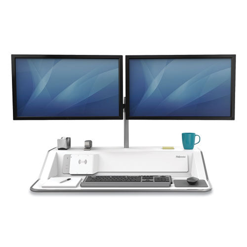 Built-in charging station with wireless charging stand that makes staying productive effortless. Patent-pending Smooth Lift Technology keeps your workstation stable and makes changing positions effortless. Contains Microban® antimicrobial technology for powerful, continuous product protection against bacteria. Features 22 different height settings and 17" of vertical adjustment so you can work in a position that's perfect for you. Innovative cord management with rear USB ports for your keyboard and mouse allows your entire workspace to move freely with you. Integrated 2-port USB charging station also features wireless charging for Qi-enabled devices. Arrives fully assembledno complicated instructions, no mounting, just unpack and get started. Holds up to 35 lbs. Compatible with Fellowes® Lotus Monitor Arm Kits-not included.