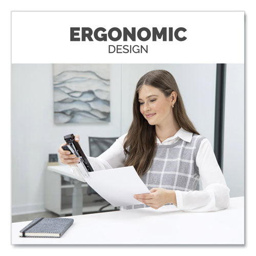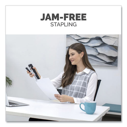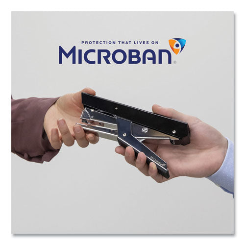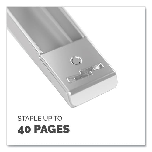 Treated with Microban® Antimicrobial Technology to help prevent bacteria. Works 24/7 for an added level of product protection. Easily staple 40 sheets of paper. Smooth, jam-free performance ensures successful stapling every time. Staples two to 40 sheets with 0.31" staples. Stapler also works with 0.25" staples. Constructed with premium metal. Low staple indicator lets you quickly see when staples are running low. The comfort grip makes for smooth, easy stapling every time.