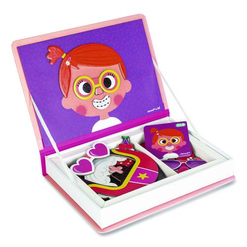 Cardboard magnetic educational game based on a theme; composed of many magnets and cards. Once the book is opened, the object of the game is to use the magnetic background for the placement of magnets to recreate the scene indicated on the card. Children can also have fun mixing the various interchangeable pieces to create their own stories. Educational learning aid, enhancing cognition and dexterity.Package Includes: (55) Magnetic Shapes; (10) Cards