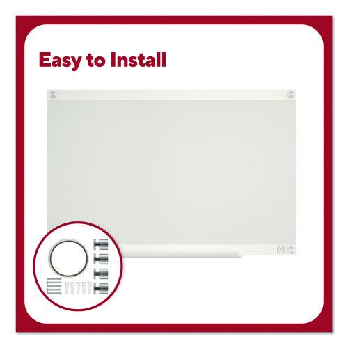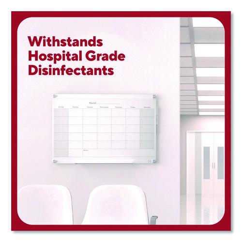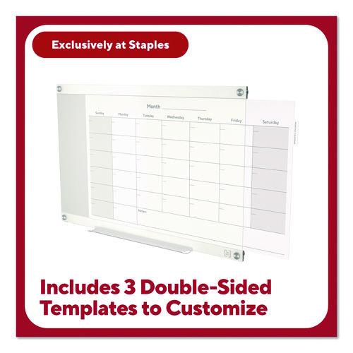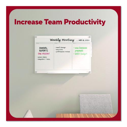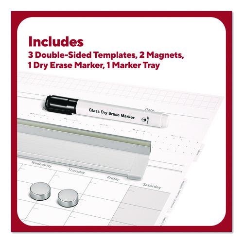 This glass board comes with six templates to provide structure and enhance your team's productivity. Manage schedules or deliverables, run brainstorms and collaborate or keep your team organized with three, durable double-sided templates. Easy-pull tabs make it easy to swap between templates. The rear template storage compartment allows for easy access to templates and convenience. This board is intended for heavy use, so it can be used with hospital grade disinfectants and it won't stain. Additionally, the magnetic backboard allows users to attach documents or visual aids, helping to improve workflow and productivity.Package Includes: Accessory Tray; Black Dry Erase Marker; (2) High-Powered Magnets