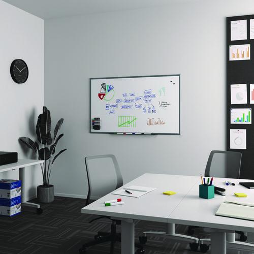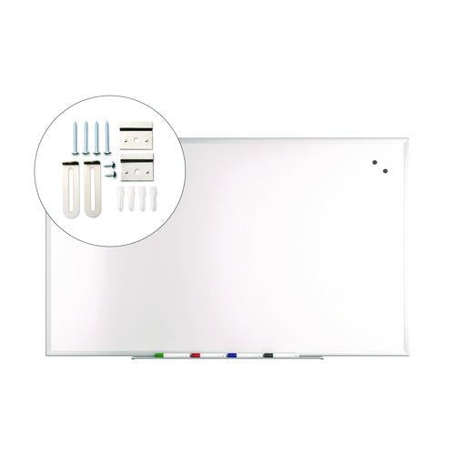 This TRU RED whiteboard features a durable, non-porous magnetic porcelain surface that prevents marker ink from penetrating the board and makes cleaning just as easy as writing. The magnetic surface of the board is perfect for brainstorming additions like papers, photos, or designs. The large surface area of the board is easy to care for, perfectly sized for use in the office or the home, with an added versatility that allows vertical or horizontal placement. Clean when necessary but know that those long-term ideas can stay up without worrying about leaving a permanent stain. The dry erase kit includes an easy-to-install mounting kit and instructions, and a four pack of TRU RED chisel tip assorted dry erase markers in vivid colors including black, red, blue and green. TRU RED markers feature a unique Squircle barrel shape that provides a comfortable grip and keeps the marker from rolling on flat surfaces. Markers can be stored conveniently on the included accessory tray.Package Includes: Mounting Kit; Accessory Tray; (4) Assorted Chisel Tip Dry Erase Markers