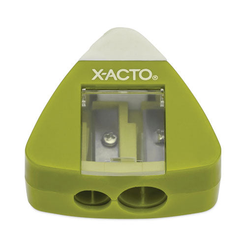 Conveniently sharpen your pencils and erase mistakes with the X-ACTO triangle manual pencil sharpener. With a built-in eraser, you'll be able to switch from sharpening to correcting in no time. The small, handheld pencil sharpener sharpens two different pencil sizes, while its portable and lightweight size makes it easy to carry in backpacks or tuck into desk drawers.