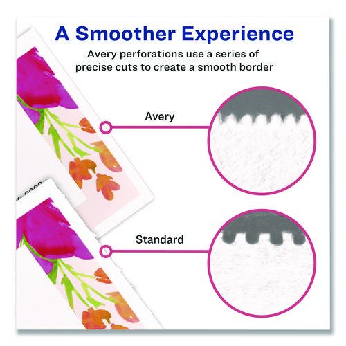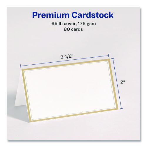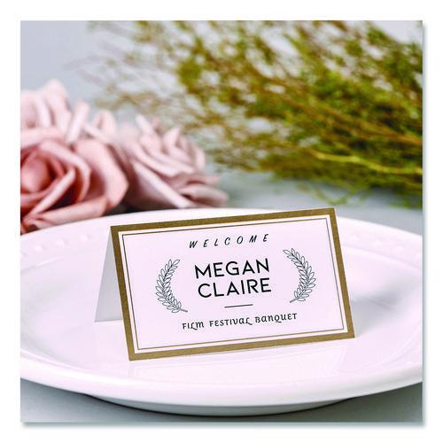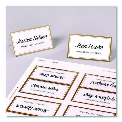Add an elegant touch to meetings, conferences, and weddings with Avery 3328 Matte White 2" x 3.5" Cards with Metallic Gold Borders. Featuring a stunningly reflective pre-printed gold border on one side, the gilded edges add a brilliant glow to food identification cards and place cards for weddings, baby shower, anniversaries, and other celebrations. Both sides of the sheet are printable so that you can create beautiful double-sided designs. Designed to leave a smooth border, a series of precise cuts are used around the edge of each tent card to separate easily. A light indent in each tent card makes it easy to fold cleanly down the center. These cards are also made with 65lb cover/176 gsm cardstock that is compatible with both laser printers and inkjet printers. Our intuitive design software helps you line up your design within the metallic tent card borders so that your text and artwork fit perfectly. Pair these tent cards with other Avery labels, cards, tags and tent cards featuring metallic gold borders to complete the look. For best results, use the paper setting for cards and feed each sheet one at a time through your laser or inkjet printer.