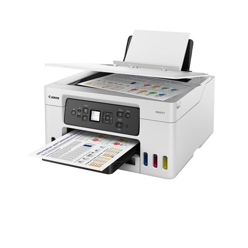 Get the job done during those busy months with a monthly duty cycle of up to 33,000 pages. Small footprint is designed to fit your workspace. With a 4-color pigment ink system you'll get crisp color and black and white documents along with sharp highlighter resistant text. Easy to fill ink bottles are a keyed shape so the nozzle only fits and fills the correct color ink tank. High page yield with up to 6,000 black pages and 14,000 color pages with just a single set of inks. Large paper capacity with a 250-sheet cassette,100-sheet rear tray and one rear flat tray.Package Includes: Set Up Ink Bottles (GI-26: BK, C, M, Y); Documentation; Power Cord