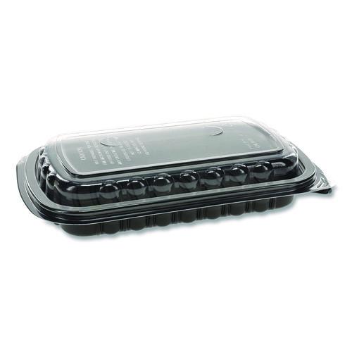 MealMaster® two-piece rib container is designed to showcase pre-cooked ribs and other entrees or side dishes by providing outstanding anti-fog technology coupled with a high clarity dome for exceptional visual appeal. ZipSeal™ provides increased leak resistance with an improved dome seal and microwaveable base. The mineral filled polypropylene (MFPP) bases are made with 50% less plastic than traditional polypropylene (PP) containers, reducing fossil fuel based material usage.