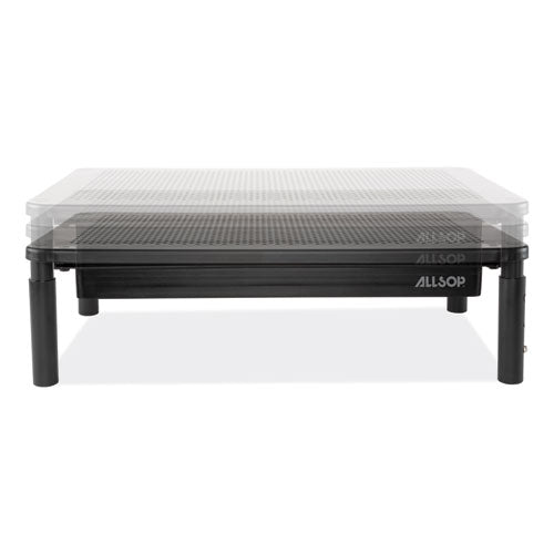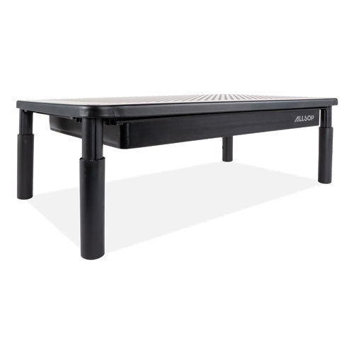 The Allsop Metal Art Tri-Level monitor stand features a durable powder-coated metal platform with micro-dot perforated holes and supports monitors up to 30 lbs and 27 inches. The telescoping legs allow users to choose from three height levels (4.13 inches, 5 inches, or 5.75 inches) for ideal ergonomic comfort. The integrated storage drawer is the perfect place for extra supplies and has a phone slot for easy access.Note: This is a non-returnable item.