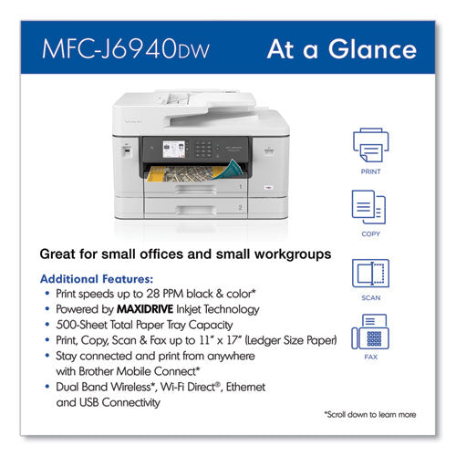 The Brother MFC-J6940DW color inkjet all-in-one printer delivers the functionality your office needs for optimum business performance. Print professional quality text and graphic documents at print speeds up to 28 ppm (black and color). A smart choice for businesses that need a printer to handle mixed media sizes; two 250-sheet capacity paper trays offer flexibility to print, copy, scan and fax on paper up to 11" x 17" (Ledger) size. Raising the bar with single-pass duplex copy and scan functionality. Use convenient NFC mobile printing or access features on the go with the free Brother Mobile Connect App. Whether you print a little or a lot, the convenient Brother Refresh EZ Print Subscription Service erases the worry of running out of ink. The Brother MFC-J6940DW color inkjet All-in-One printer offers reliable, professional-quality printing for any small work group or small business.Package Includes: Black Start Ink Cartridge; Cyan Start Ink Cartridge; Magenta Start Ink Cartridge; Yellow Start Ink Cartridge; Quick Setup Guide; Product Safety Guide; Reference Guide; Telephone Line Cord; Warranty Card