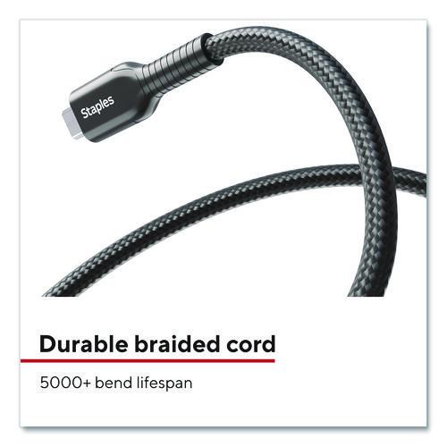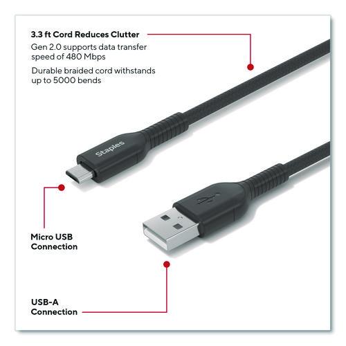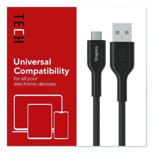 Upgrade or replace a damaged cable with one that will last like this Staples® Micro USB to USB-A Braided Cable with universal compatibility. The unique braided design provides extra durability, prevents tangles and has been tested to withstand up to 5,000 bends. The cable length gives extra reach when needed and is perfect for comfortably using devices while they charge.