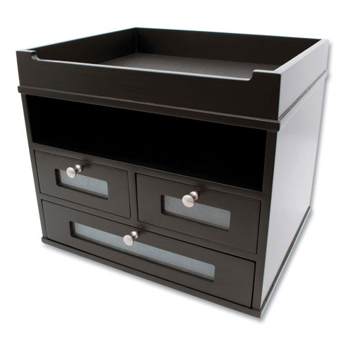 Unique storage piece incorporates several different types of organization. Large in/out letter tray on top is great for files and papers. Open front slot can house frequently used reference materials. Two small drawers hold knickknacks, while the large drawer handles larger office supplies. Brushed metal knobs, frosted glass accents and hand-finished matte black surface provide a modern look, making it a centerpiece for your desk.Package Includes: Assembly Hardware; Assembly InstructionsNote: This is a non-returnable item.