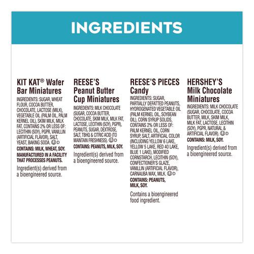 Get the party started with this Hershey®'s Milk Chocolate Mix Mini Assortment! There's something for everyone and every occasion: Kit Kat® Milk Chocolates, Reese's® Peanut Butter Cups Miniatures, Reese's® Pieces and Hershey®'s Milk Chocolate Bars.Note: This is a non-returnable item.