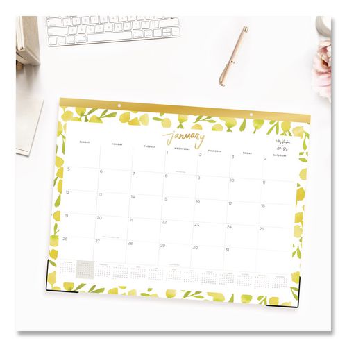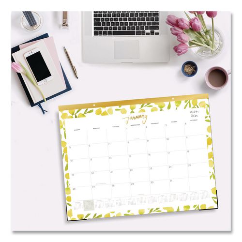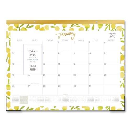 Stay focused and uplifted with this beautiful Kelly Ventura for Blue Sky® desk pad calendar! The fresh abstract lemon artwork by the Michigan artist will keep drawing you back in, making your organization dreams come true. The calendar features generously sized daily blocks for multiple entries and lists all major holidays. A reference calendar with 13 past/future months is included on each page. A sturdy backboard provides a cushioned writing surface as you plan your month out, and clear corner protectors keep pages flat. The paper is premium-quality and acid-free, minimizing potential ink bleed-through.Note: This is a non-returnable item.