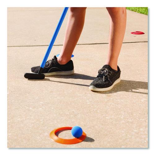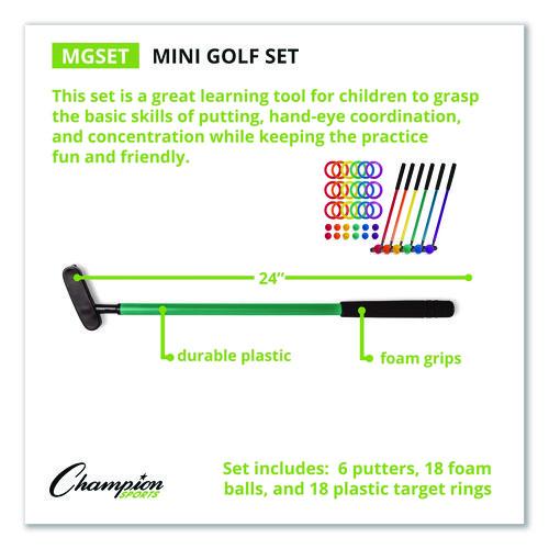 The Champion Sports Mini Golf Set is packed with fun and will bring the entire family together! It is a great learning tool for children to grasp the basic skills of putting, hand-eye coordination, and concentration while keeping the practice fun and friendly. The set of six 24" putters are made with a durable plastic shaft and head, with foam grips for easy handling. Also included are 12 solid foam balls that can roll on any surface, and 18 plastic target rings.Package Includes: (18) Plastic Rings; (6) 24" Putters; (3) Target Holes; (2) Blue Balls; (2) Green Balls; (2) Orange Balls; (2) Purple Balls; (2) Red Balls; (2) Yellow BallsNote: This is a non-returnable item.