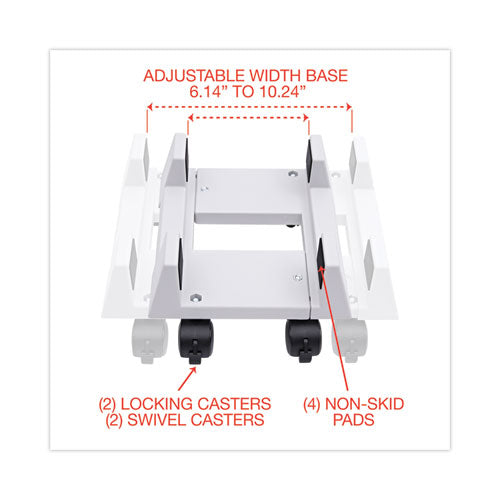 Innovera® Mobile CPU Stand is constructed with non-skid padding that securely holds a CPU in place. The adjustable base expands from 6.14" to 10.24" in order to accommodate a wide range of CPU sizes. Built with durable construction to ensure strength and stability for the most fragile equipment. The base contains four wheels, two locking casters and two swivel casters for mobility or stationary use.