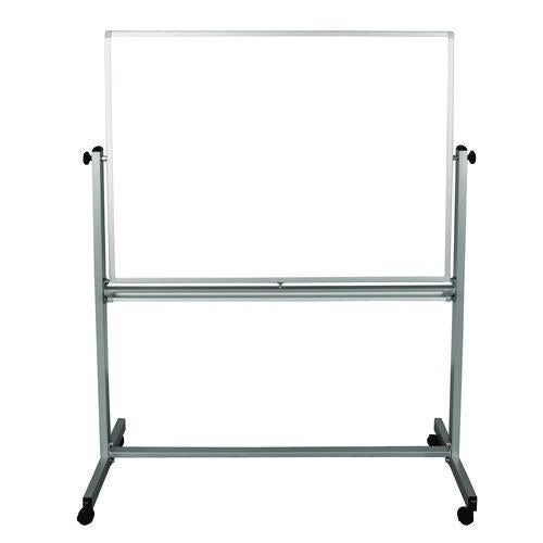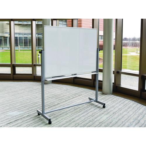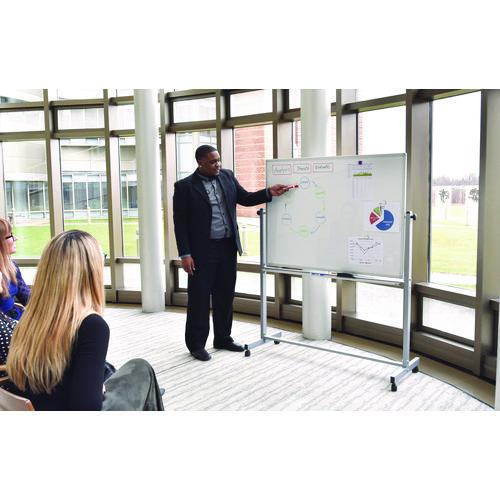 Built for brainstorming, teaching or organizing ideas and information, this Luxor mobile magnetic dry erase board doubles the writing space and delivers the durable mobility needed for dynamic workspaces. A slender-yet-sturdy frame provides a professional appearance and rolling casters make it easy move around a room. To flip the board, simply loosen the side knobs and disengage the spring-loaded locking clip. Need to display charts, papers or photos? Use the magnetic surface as a bulletin board. Look no further for a high-quality, affordable mobile marker board.Note: This is a non-returnable item.