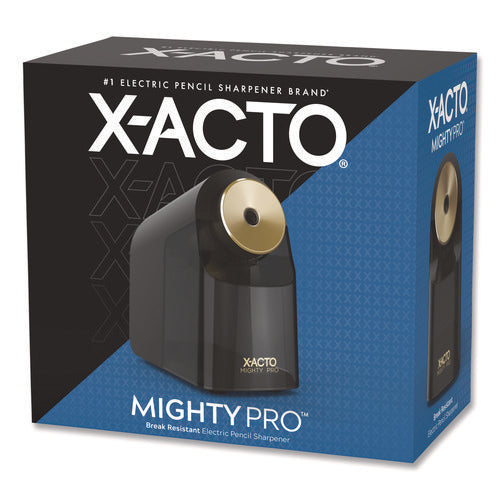 The fastest electric pencil sharpener from X-ACTO®, the Mighty Pro® sharpens woodcase pencils to a precise tip in no time. Break-resistant sharpening action ensures frustration-free operation. SmartStop prevents over-sharpening by automatically shutting off the motor when the pencil reaches ideal sharpness; and just to make sure, a bold LED lets you know when your pencil is ready to write. An auto-adjust dial seamlessly accommodates nearly any pencil size, while a slip-resistant bottom keeps the sharpener steady. SafeStart® electric motor locks the blades in place when the extra-large, easy-to-empty shavings bin is removed. Compatible with colored pencils. Stay sharp with X-ACTO®!