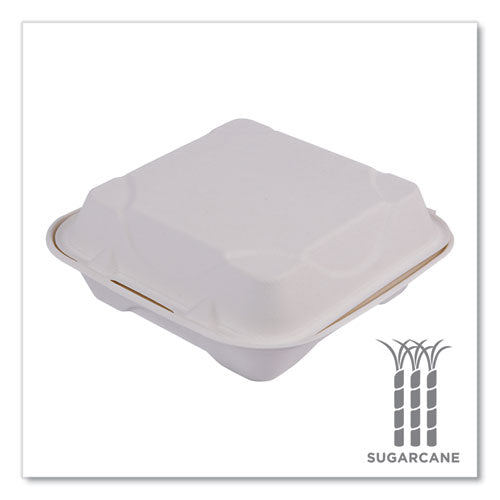 Molded Fiber Hinged Clamshell Containers, 8 x 8 x 3, White, Sugarcane, 200/Carton