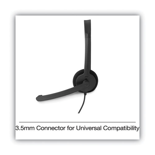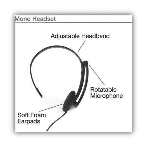 Mono headset with adjustable microphone and in-line remote combines clear sound, lasting comfort and versatile functionality, making it ideal for plug-and-play performance in a variety of applications. An ergonomic design with an adjustable headband and a soft, foam-covered earpiece help you get a comfortable fit. Boom-arm microphone features a 270° rotatable, reversible design that's easy to position for optimal voice pickup, while allowing you to fit the headset for your left or right ear. An in-line remote features both volume up/down controls and a microphone on/off button. Hard-wired 5.25 ft cable features a standard, 3.5 mm TRRS end-jack.