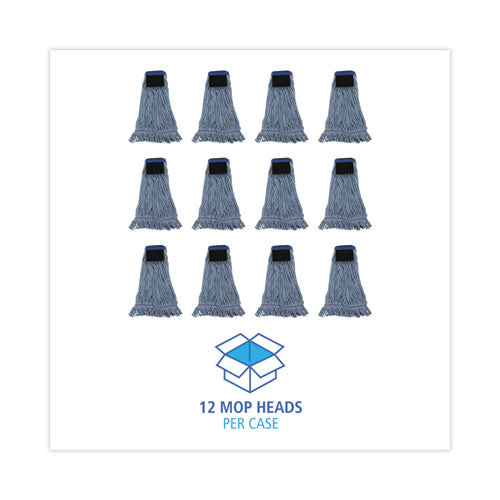 Boardwalk® Loop-End Mop with Scrub Pad is a good quality, economical, four-ply blend of cotton and synthetic fibers. The built-in scrubbing pad provides the highest level of abrasion, making it an excellent choice for foodservice areas. The blue yarn keeps the mop head looking newer for longer. Crafted with looped ends to reduce unraveling. Durable mop with a double-sewn tailband.